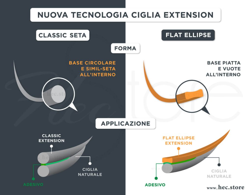 Totalmente anallergiche risultano estremamente flessibili e si differenziano per ottenere un effetto mascara molto glamour a seconda dello spessore usato. Ciglia 020 Flat Ellipse lucide sono indicate sia per tecnica classica una a una (one to one) che per effetti misti con volume.  Hanno una struttura resistente al calore, all’umidità , all’acqua, alla sauna, alla piscina, al sudore. Si applicano facilmente grazie all’eccellente qualità di produzione e di inscatolamento. Ogni confezione ha 20 strisce comodamente estraibili e applicabili con adesivo sia su appositi anellini che a ogni superficie si ritiene comoda per il lavoro (anellini o pietra).